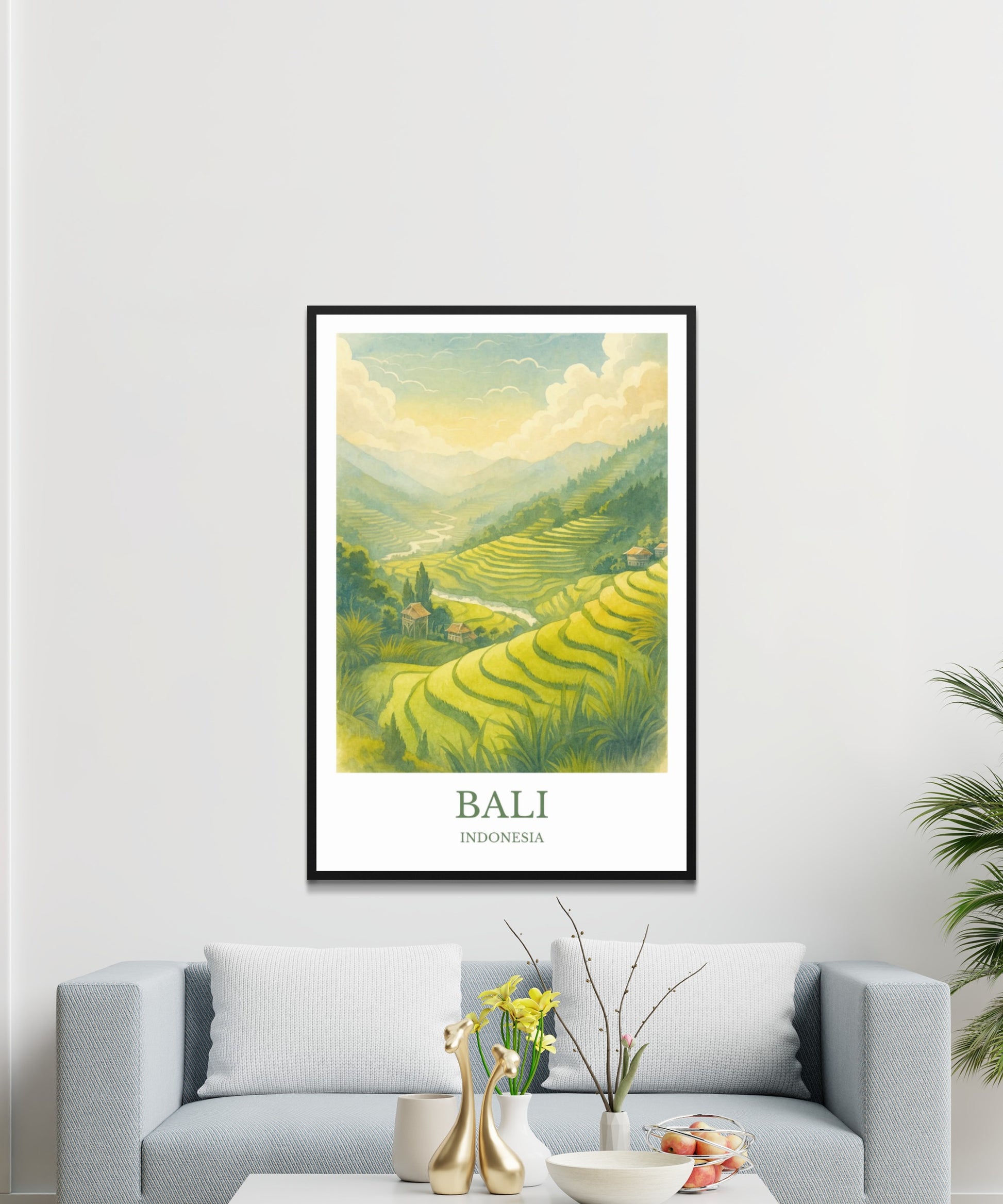 Bali Print – Designed in a beautiful vintage watercolor style. Printed on premium quality paper, and beautiful wooden framing options.