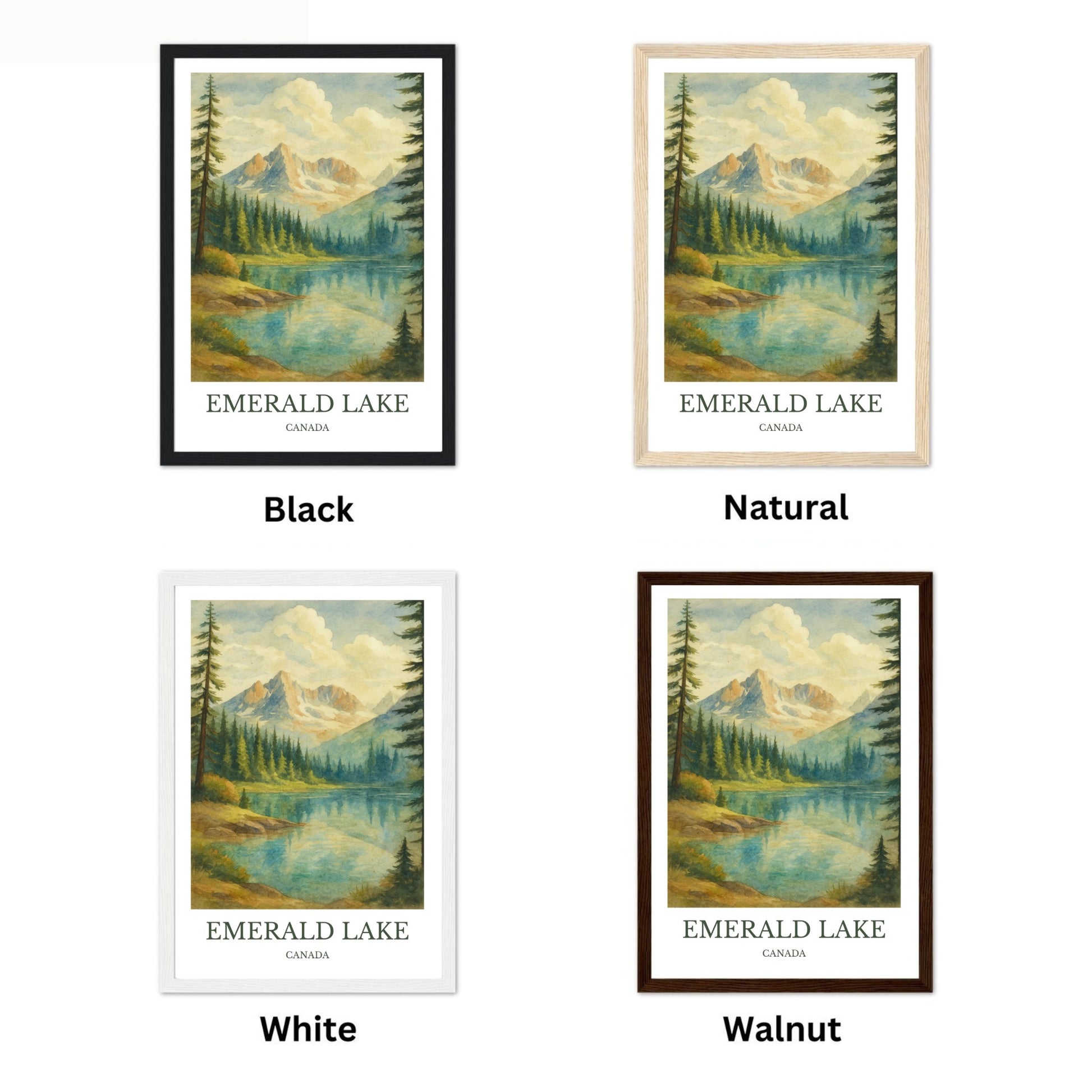 Emerald Lake Print – Designed in a beautiful vintage watercolor style. Printed on premium quality paper, and beautiful wooden framing options.