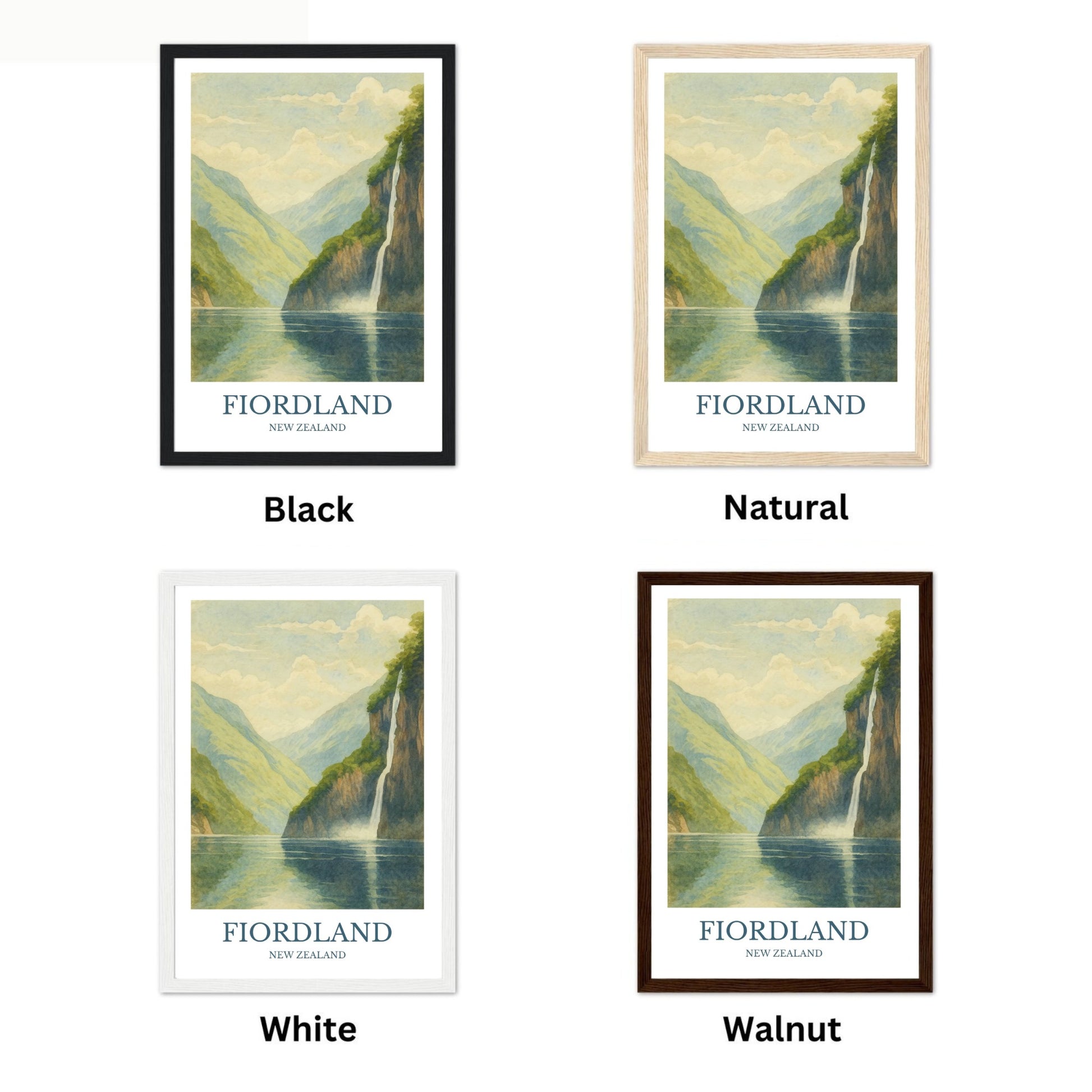 Fiordland Print – Designed in a beautiful vintage watercolor style. Printed on premium quality paper, and beautiful wooden framing options.
