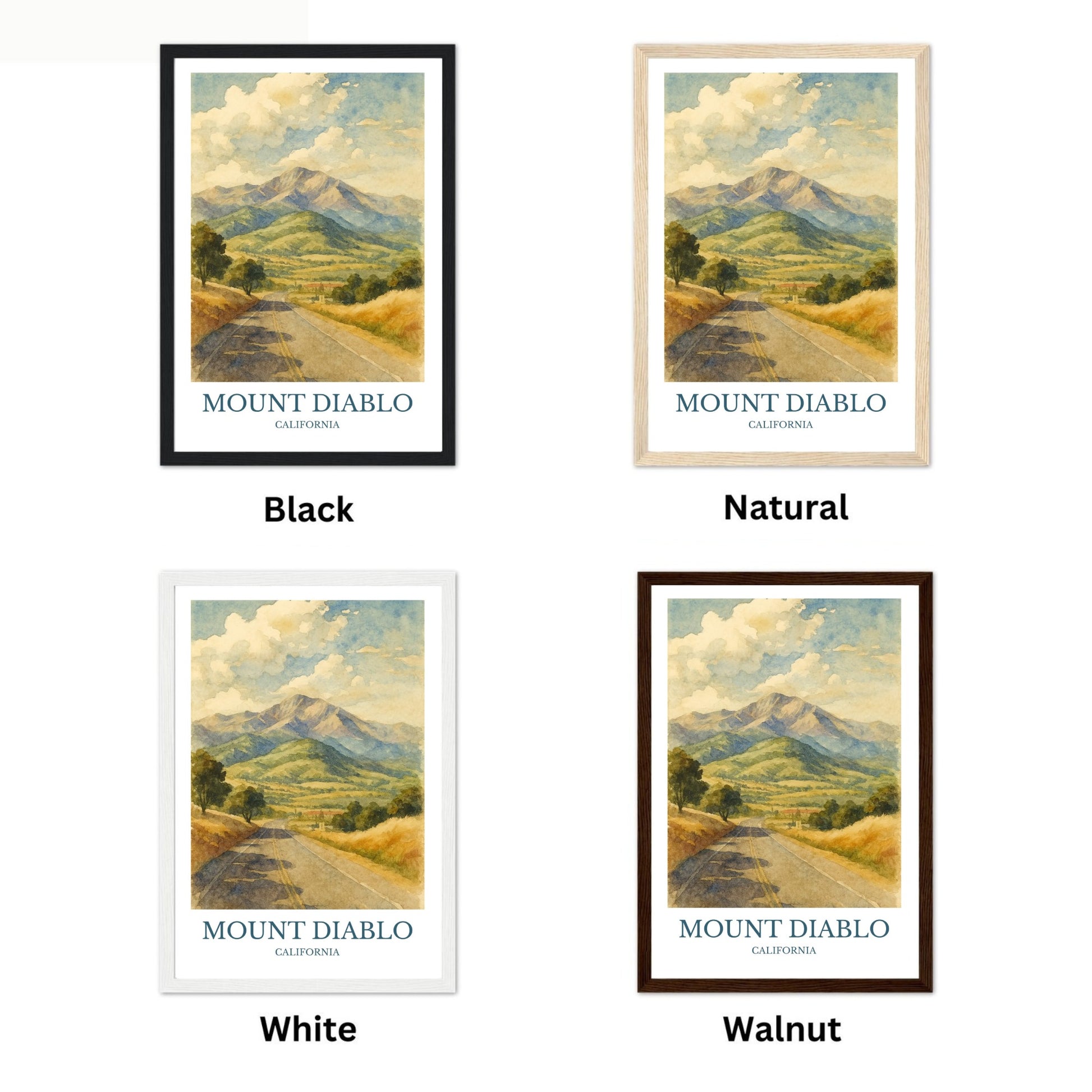 Mount Diablo Print – Designed in a beautiful vintage watercolor style. Printed on premium quality paper, and beautiful wooden framing options.