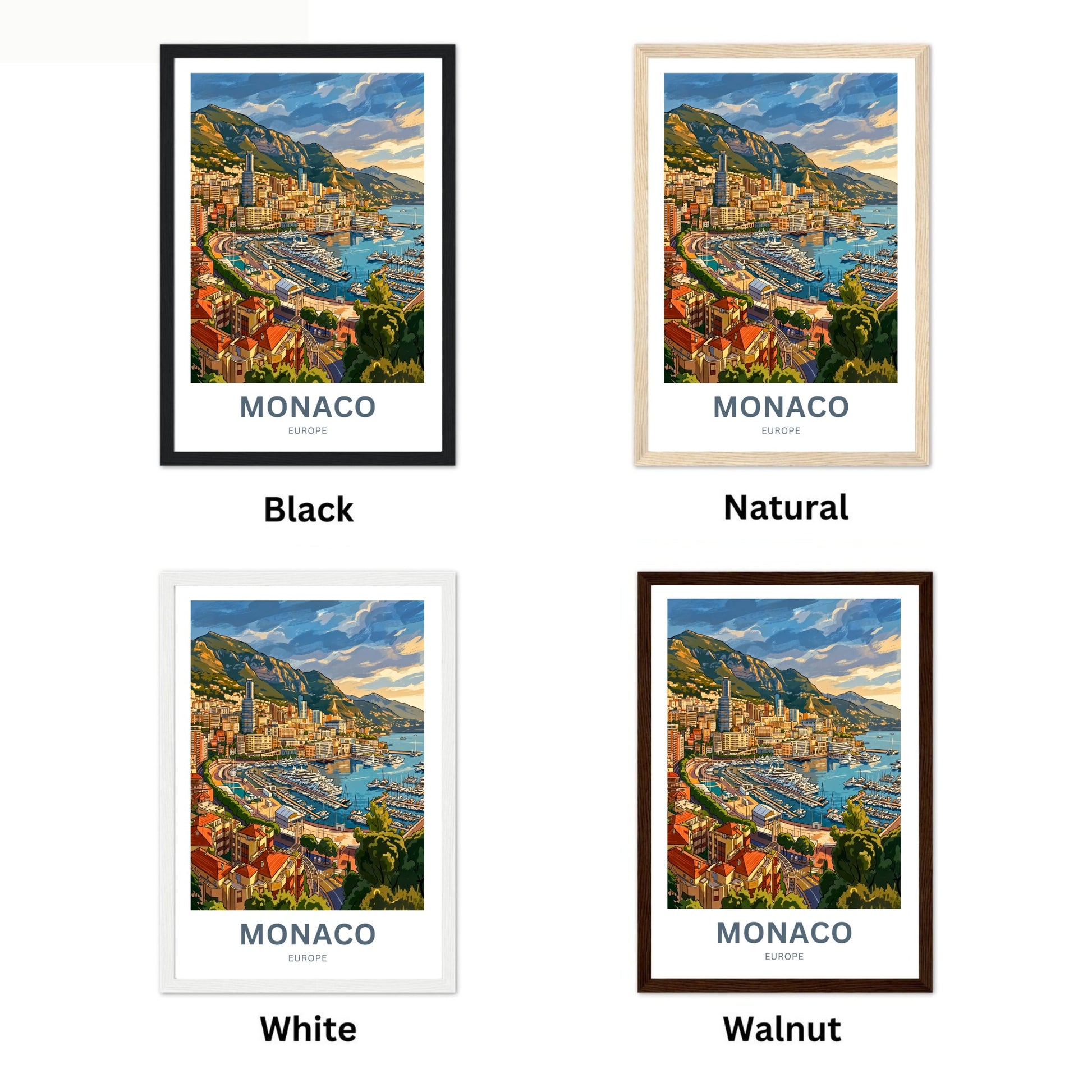 At our shop, we offer a framing service to help you enhance and preserve your artwork. We offer a selection of four beautiful wooden frames to choose from: Black, Walnut, Natural, and White