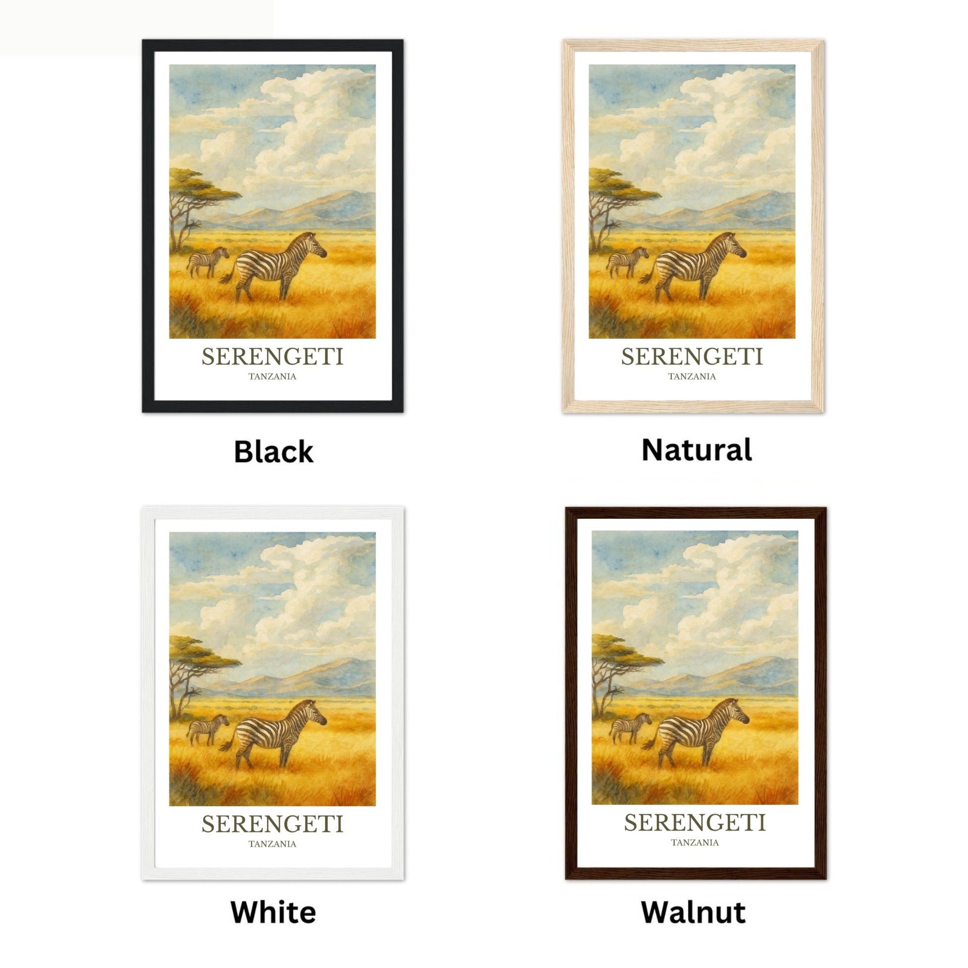 Serengeti Print – Designed in a beautiful vintage watercolor style. Printed on premium quality paper, and beautiful wooden framing options.