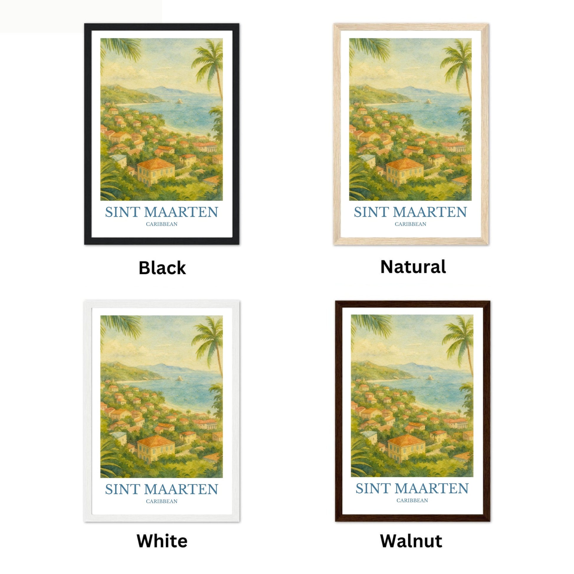 Sint Maarten Print – Designed in a beautiful vintage watercolor style. Printed on premium quality paper, and beautiful wooden framing options.