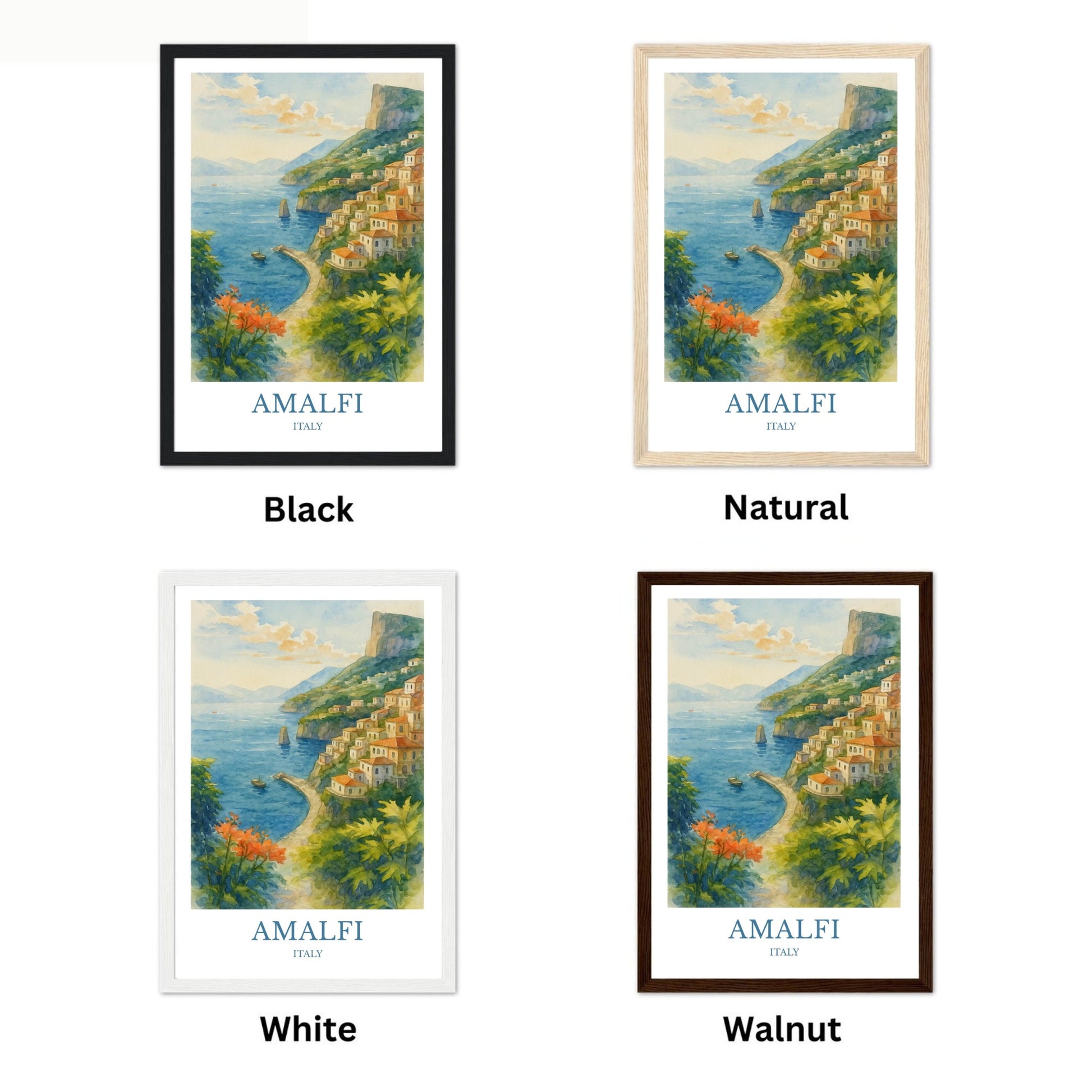 Amalfi Print – Designed in a beautiful vintage watercolor style. Printed on premium quality paper, and beautiful wooden framing options.