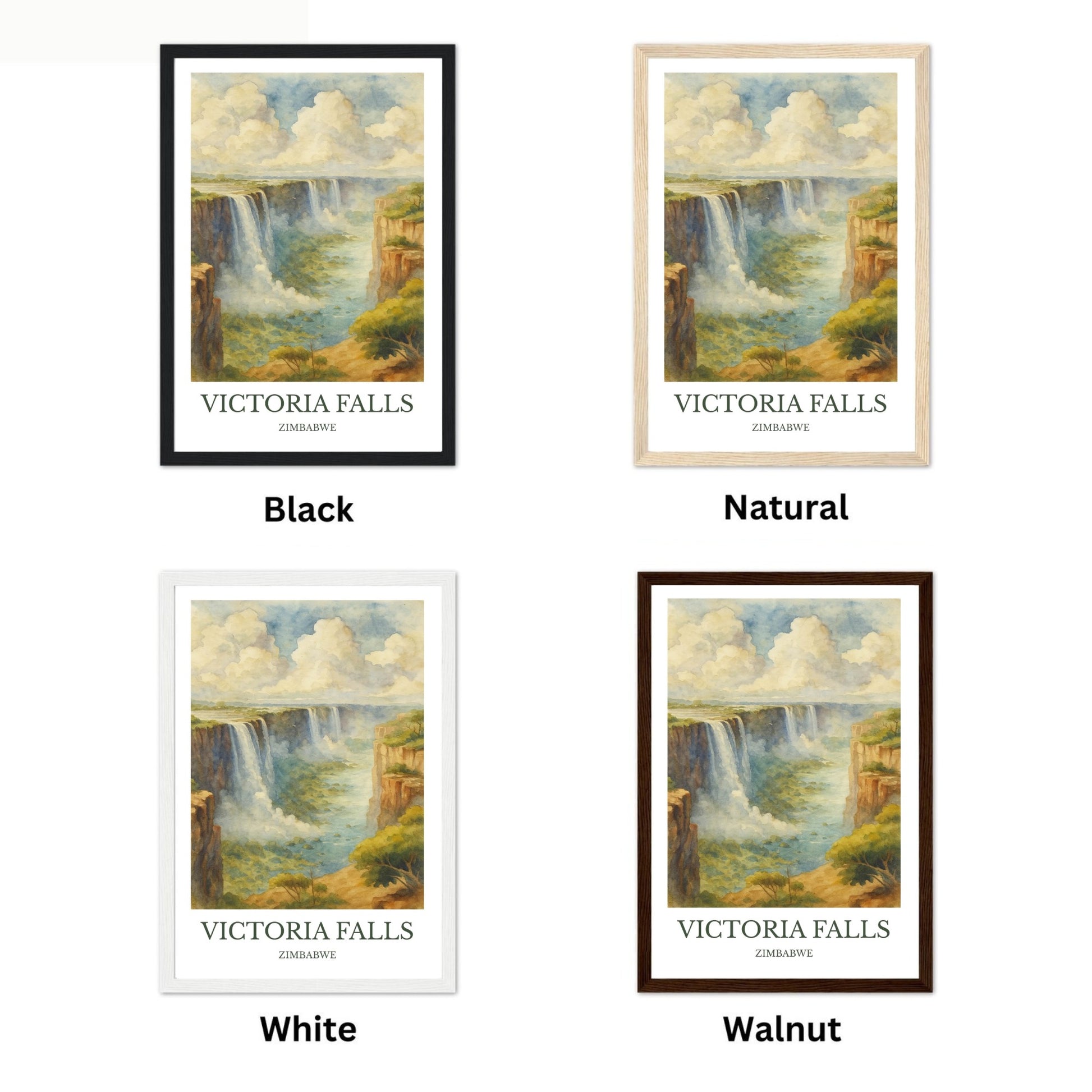 Victoria Falls Print – Designed in a beautiful vintage watercolor style. Printed on premium quality paper, and beautiful wooden framing options.